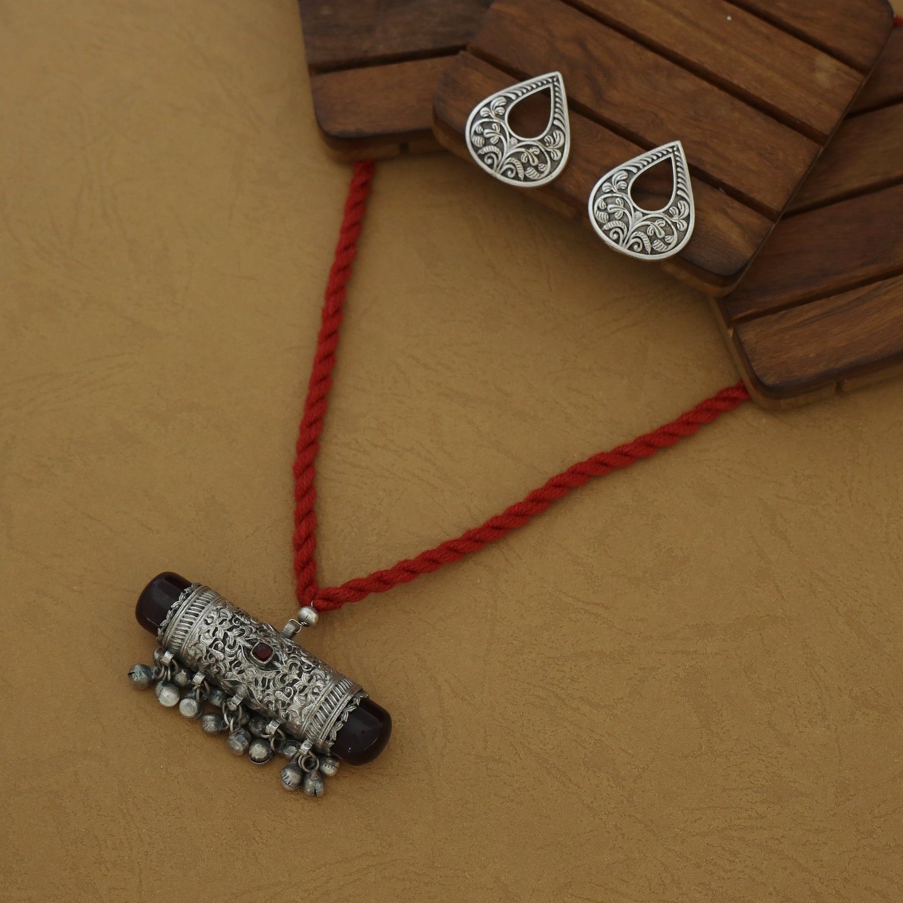 Jagvi Thread Silver Pendant Ghungroo Neckpiece With Earring