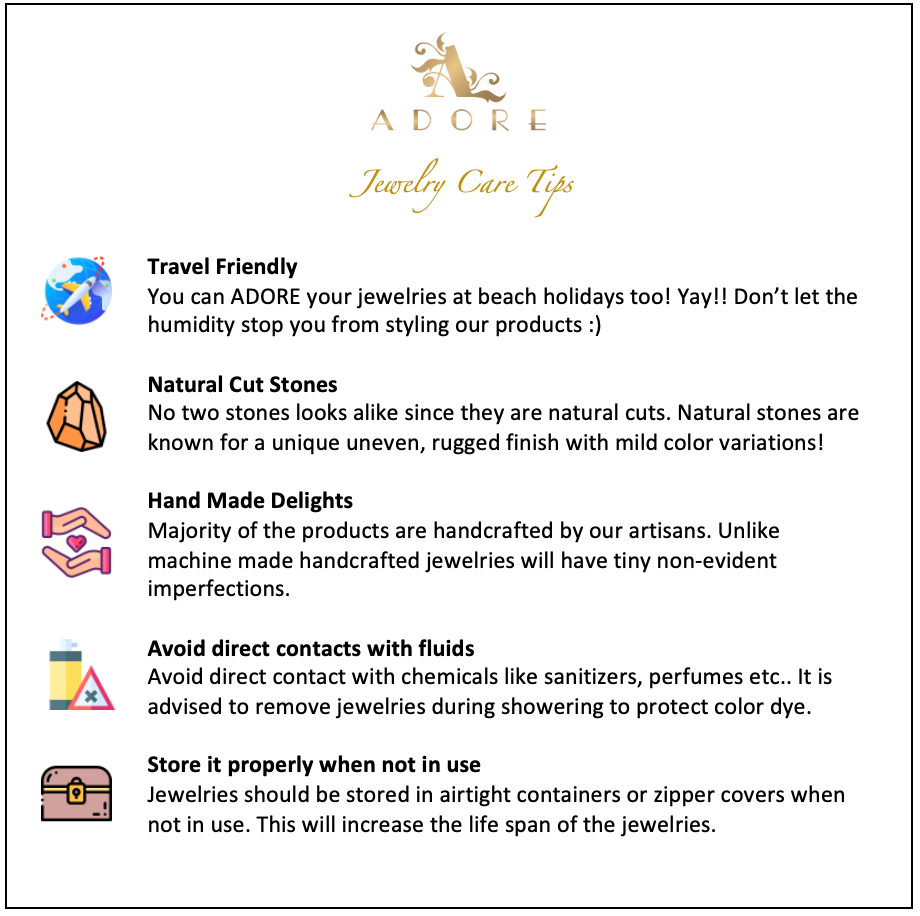 Protect your Jewellery from Sharp Blows, Scratches, and Extreme Temperatures. Avoid Contact With Perfumes, Sprays, Chemicals, and Water. Keep your Jewellery in a Clean, Dry, and Airtight Box. Wipe it using a Soft Cloth Regularly.