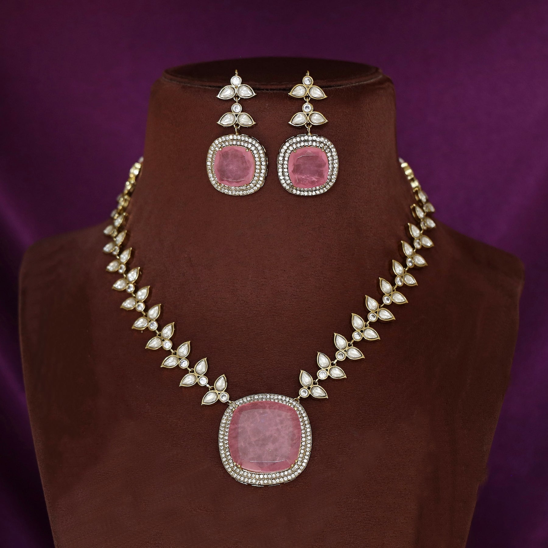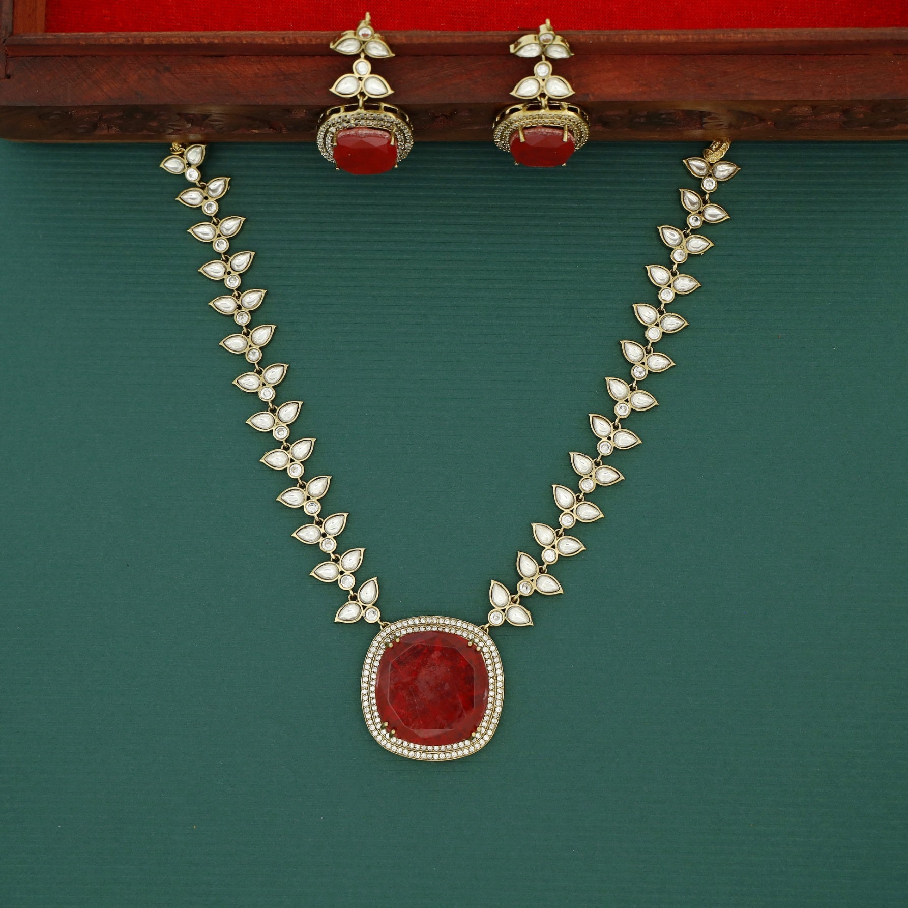 Alisha Kundan Curved Square Glossy Pendant Neckpiece With Earring