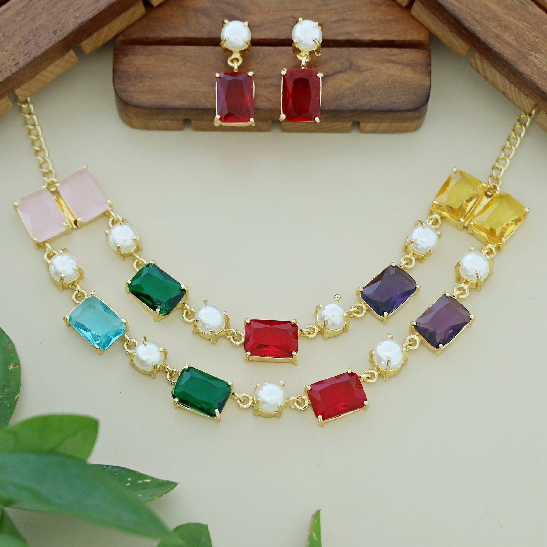 Naksha 2 Layer Multicolour Glossy Pearl Short Neckpiece  With Earring