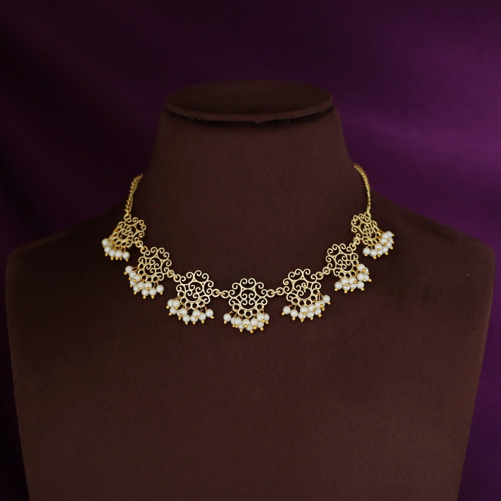 Golden Niralika Filigree Cluster Pearl Neckpiece with Earring