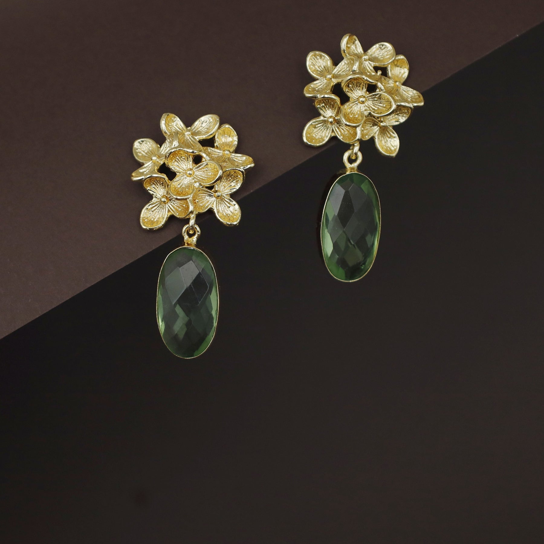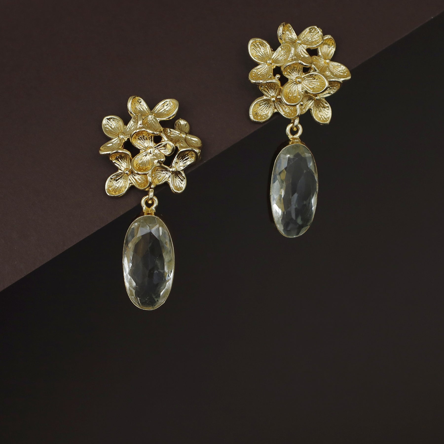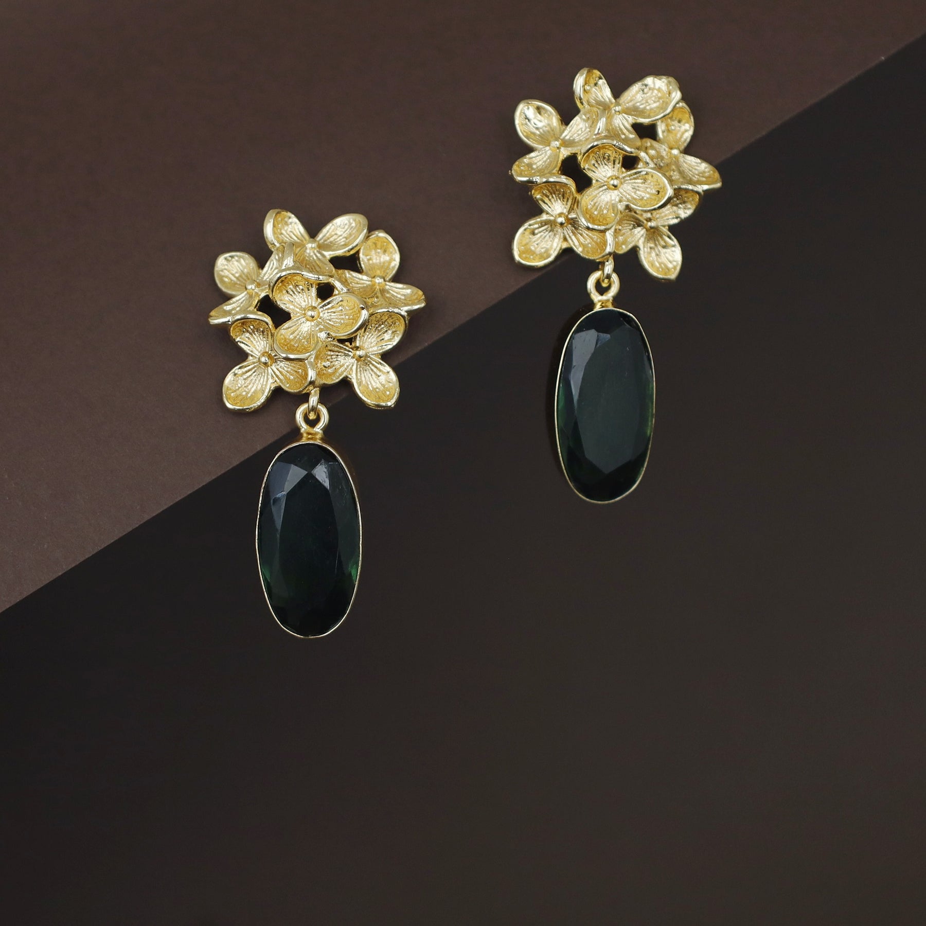 Golden Flower Bunch Oval Glossy Stone Earring