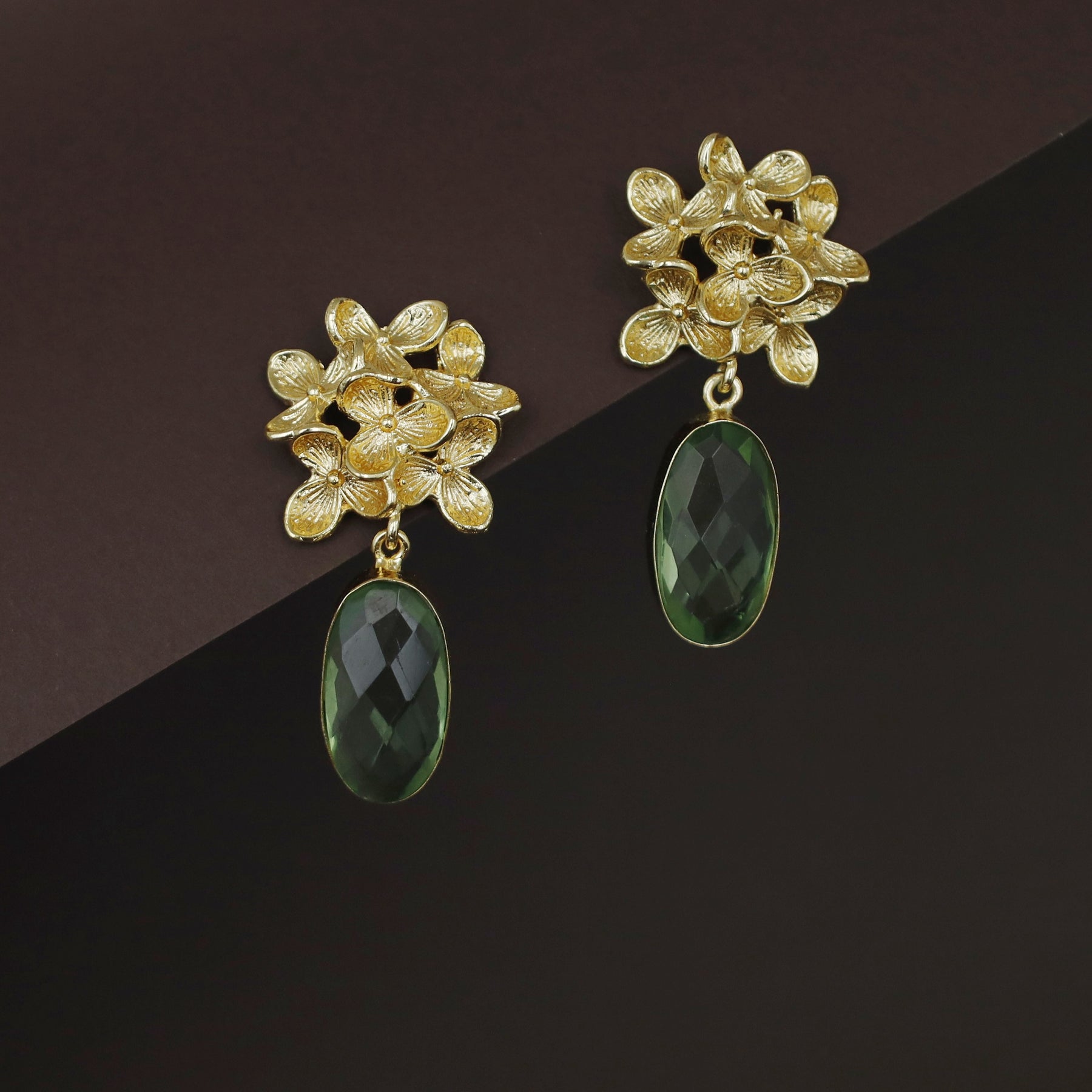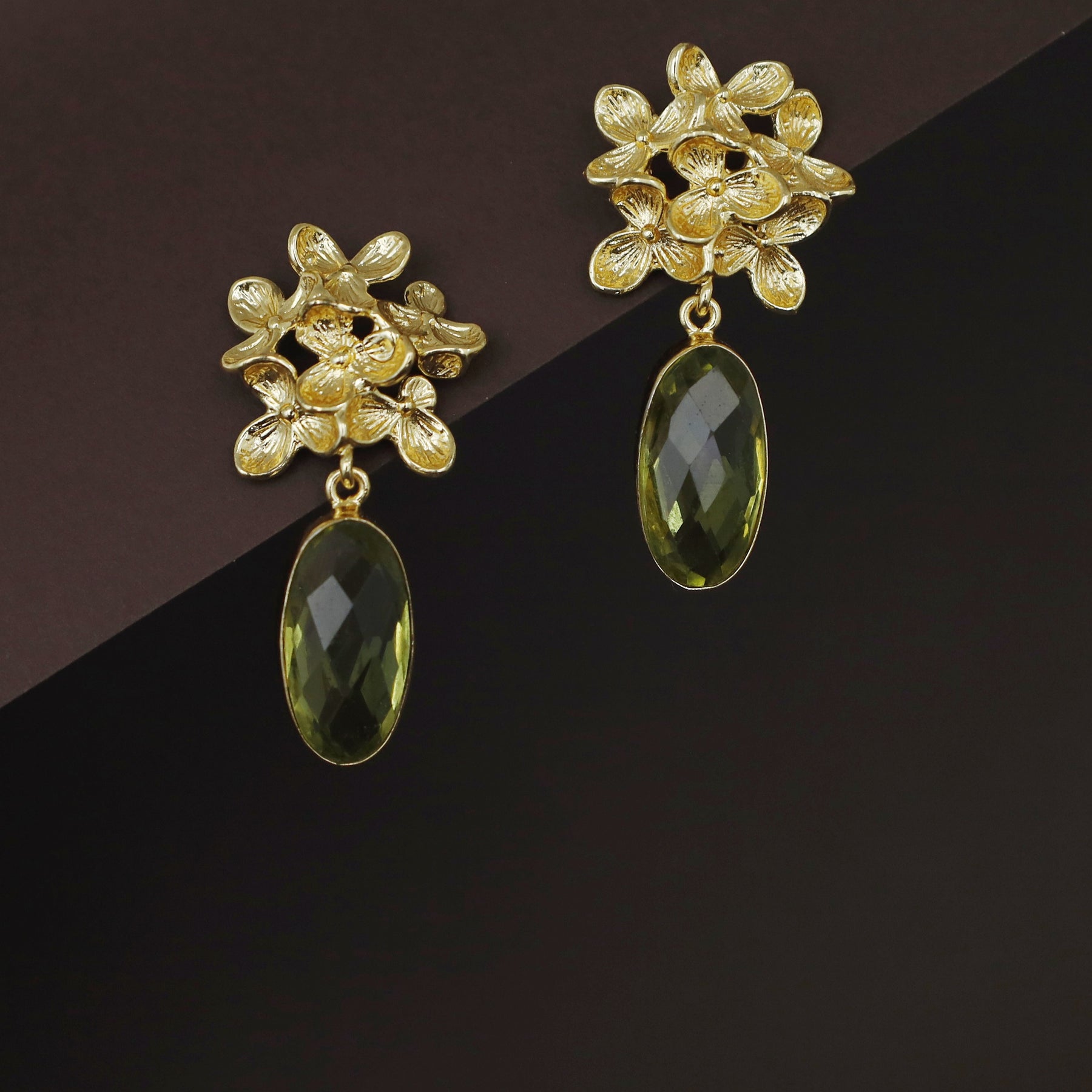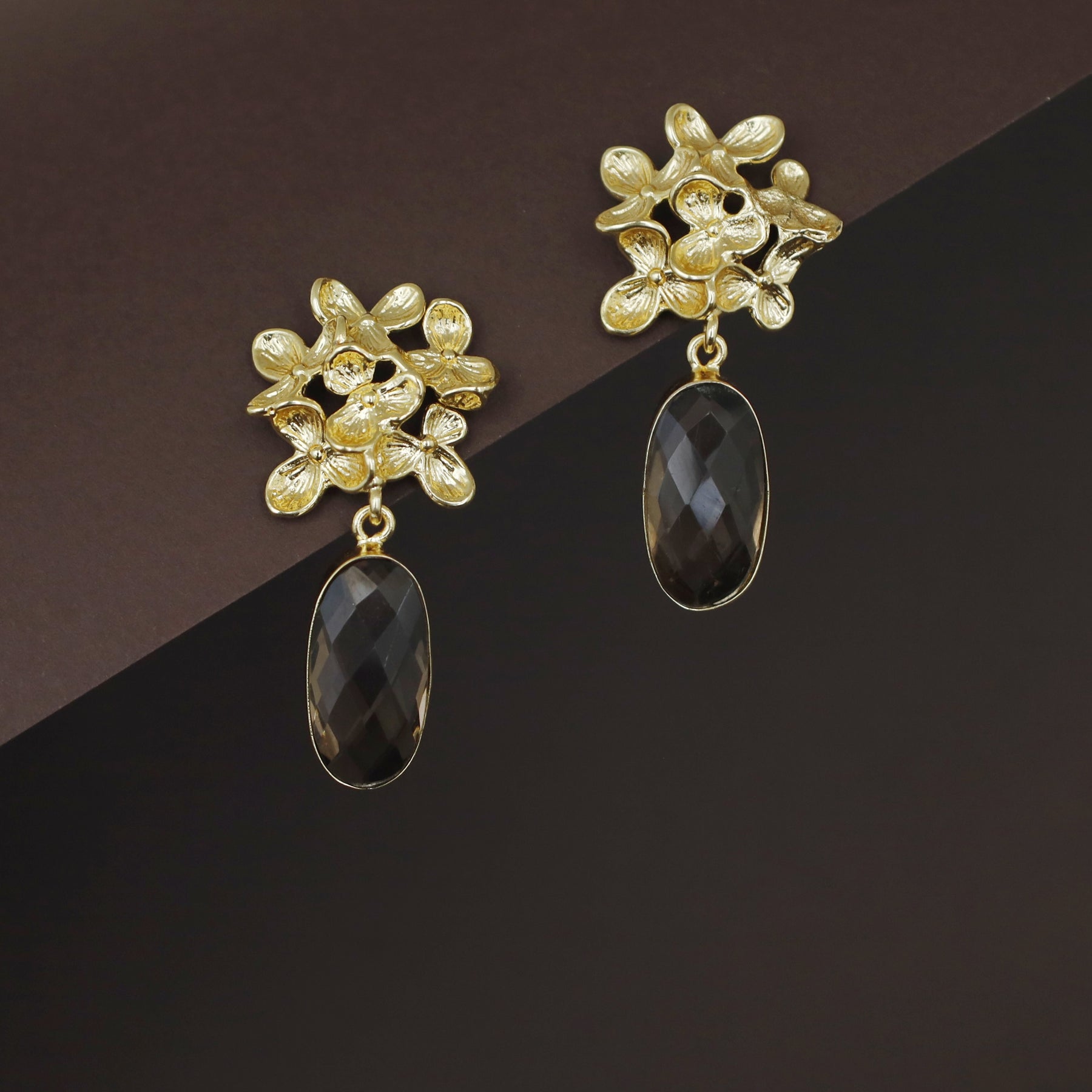 Golden Flower Bunch Oval Glossy Stone Earring