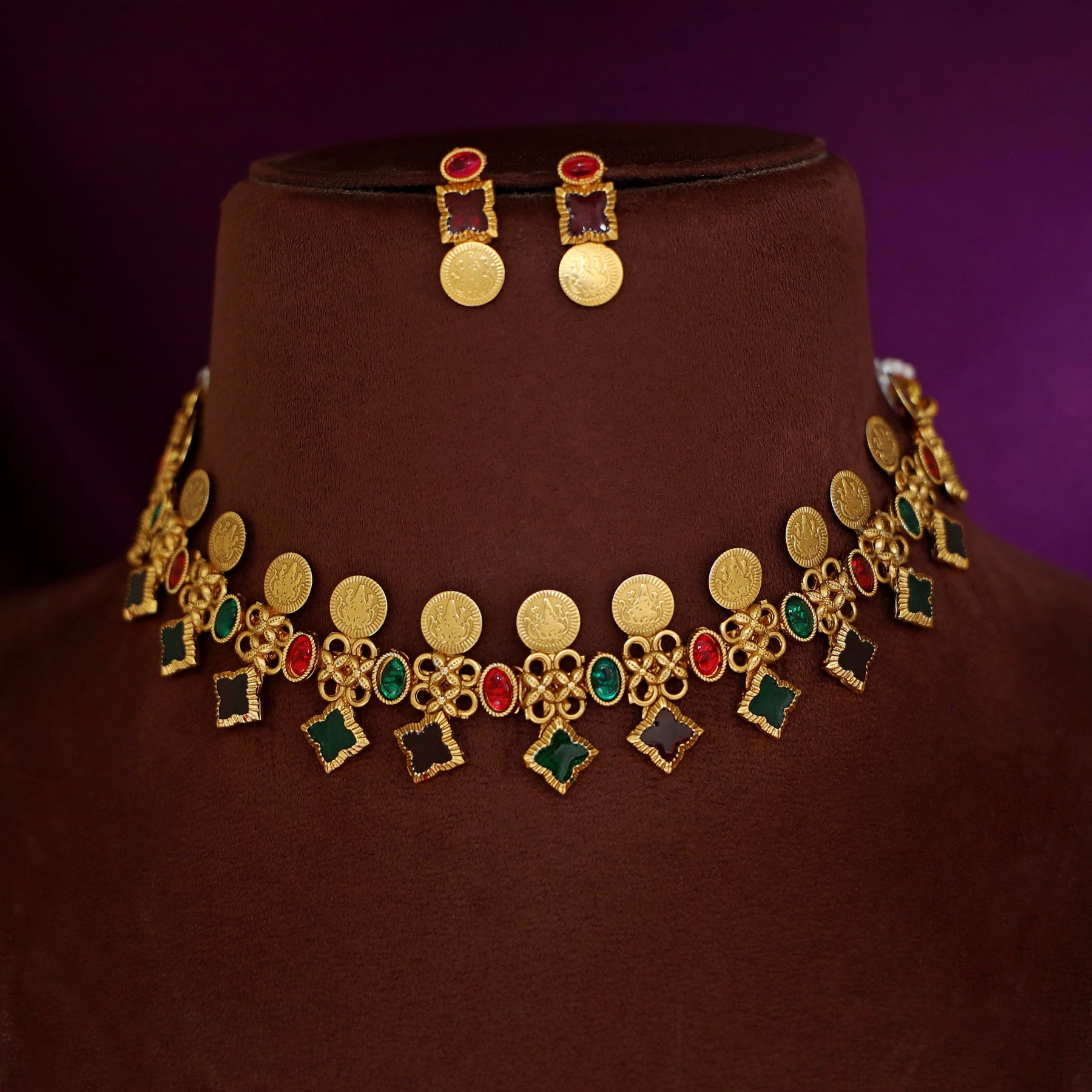 Adhitri Kemp Stone Kashi Choker/Short Neckpiece With Earring