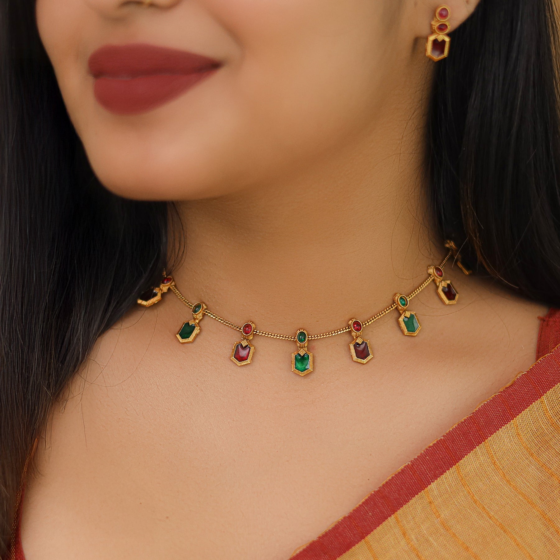 Alaka Golden Enamel Short Neckpiece With Earring