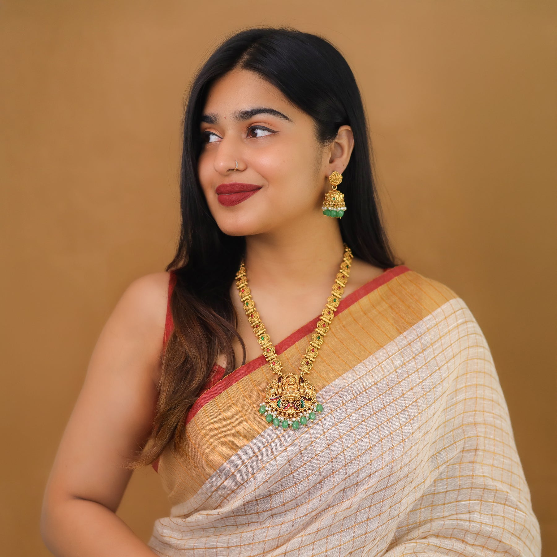 Savitri Devi Golden Stick Long Haram Neckpiece With Earring