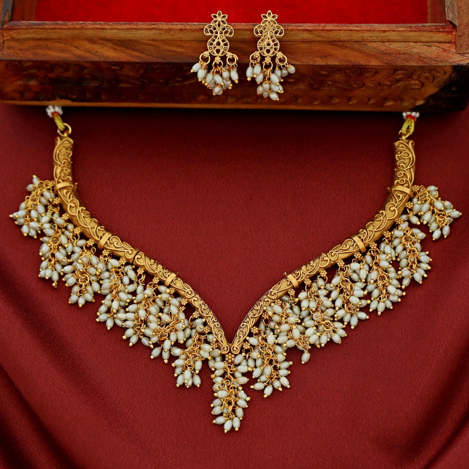 Arundhathi Hanging Cluster Pearl Stiff Wing Neckpiece With Earring