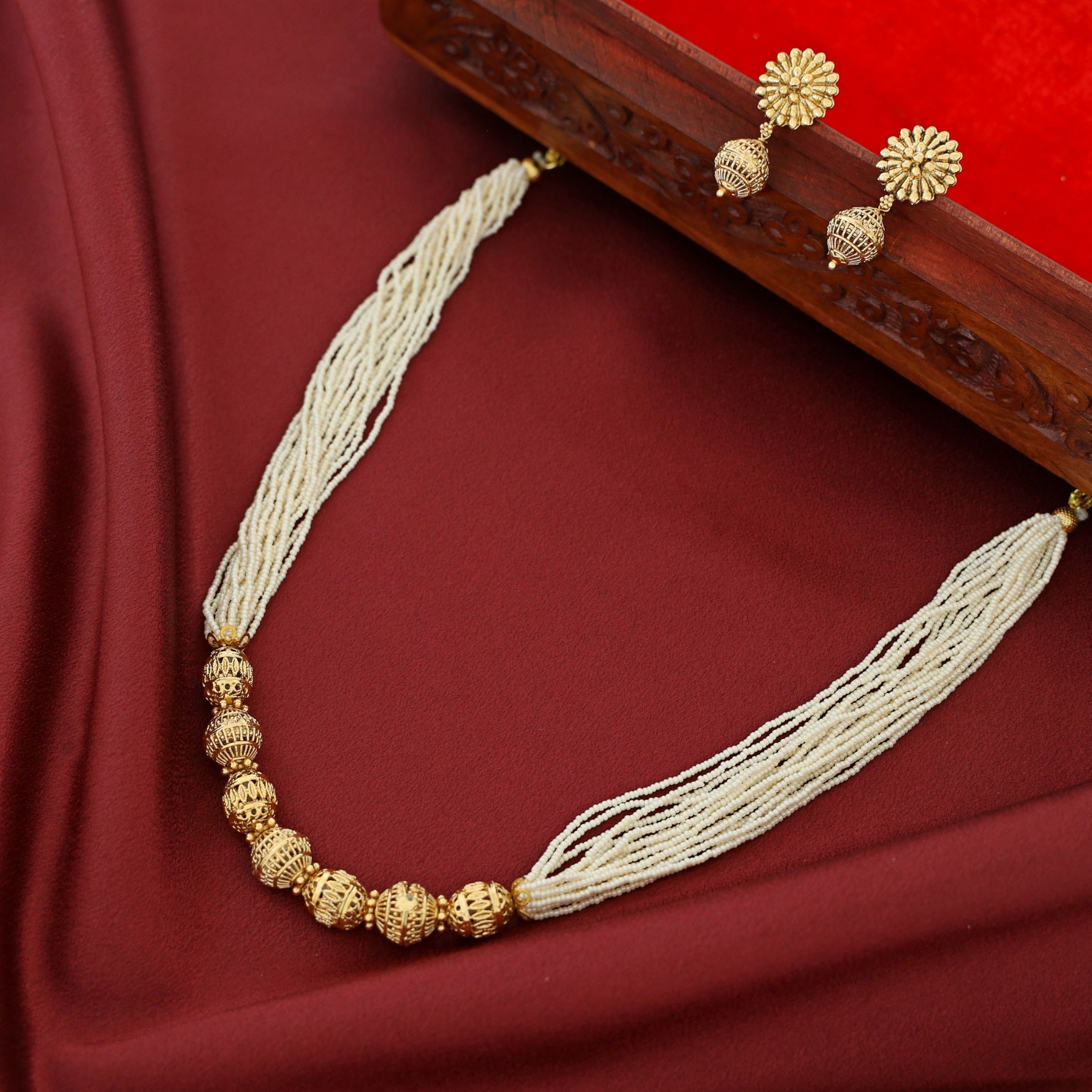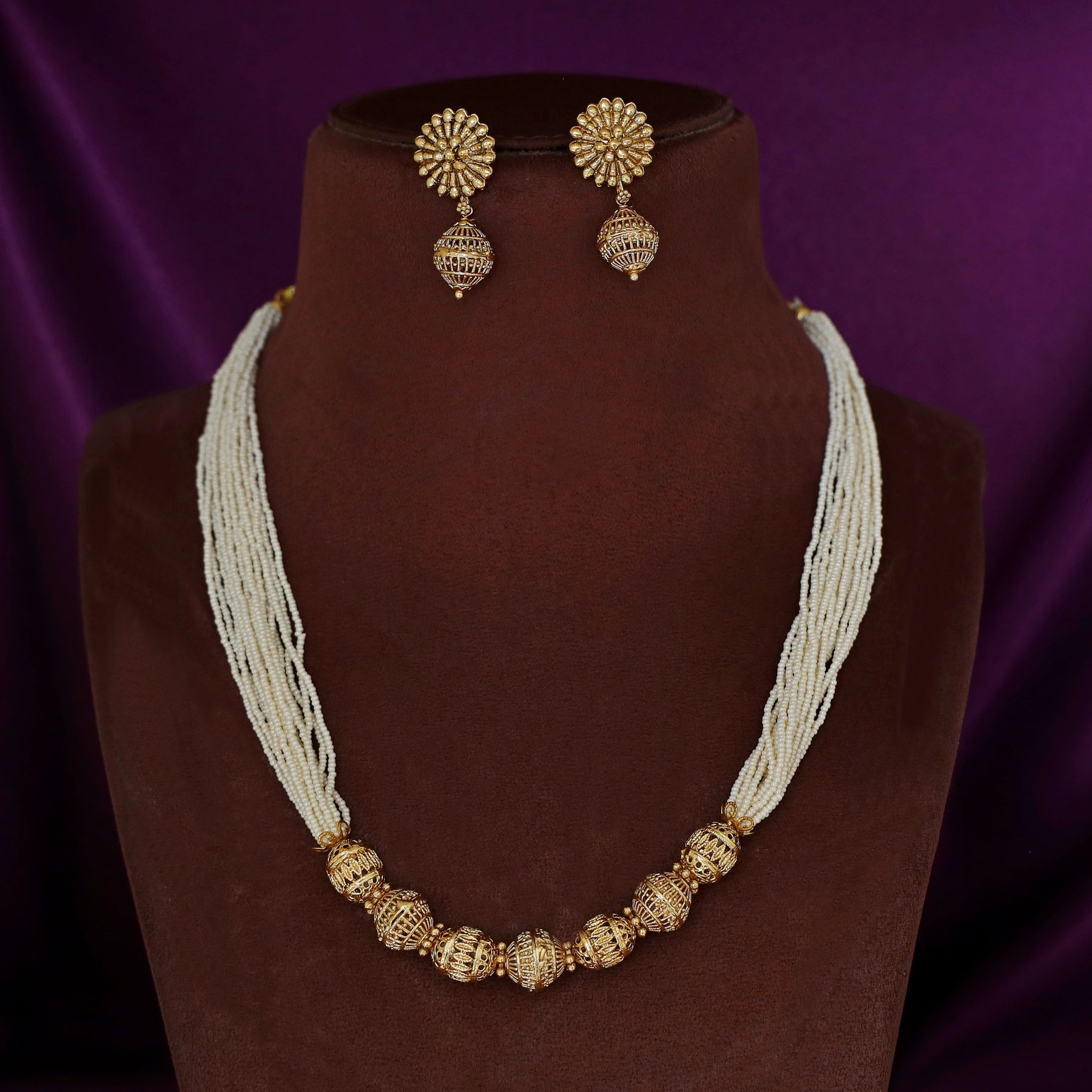 Pravika Layered Pearl Beaded Gold Ball Neckpiece With Earring