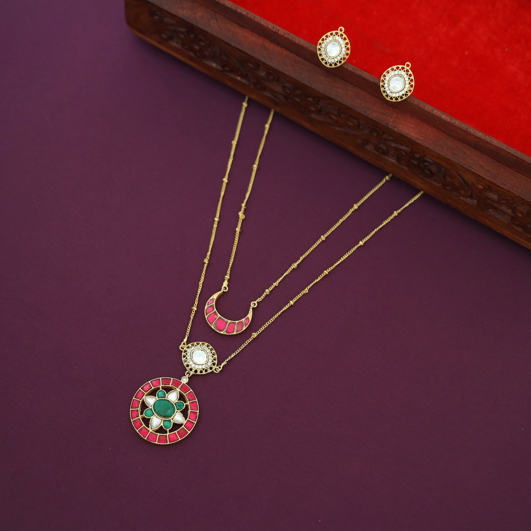 Premium 2 Layer Jadau Kundan Circle & Half Moon Neckpiece With Earring