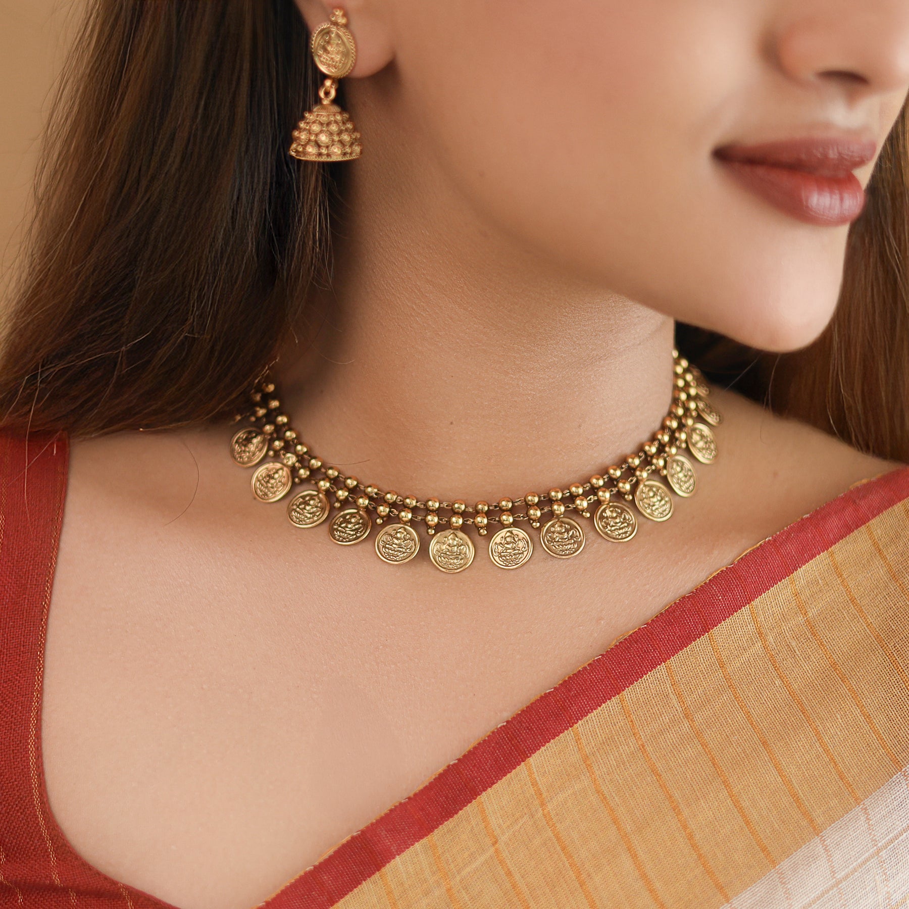 Two Layer Golden Ball Kashi Lakshmi Neckpiece With Earring