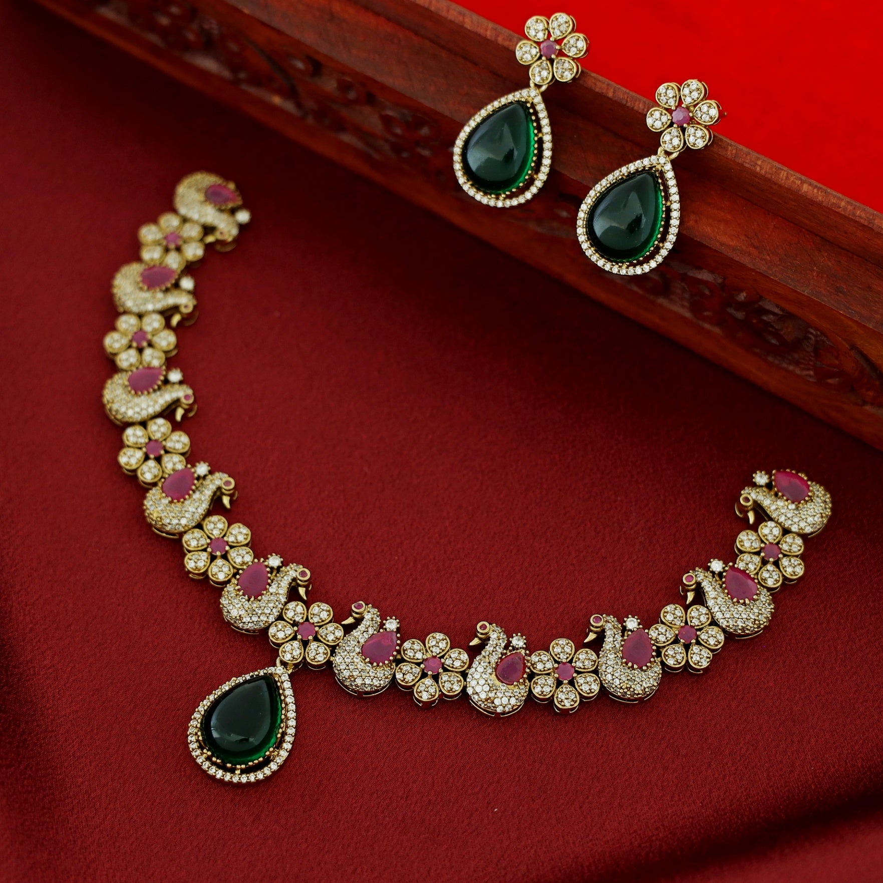 Premium Shanaya AD Stone Glossy Swan Drop Short Neckpiece With Earring